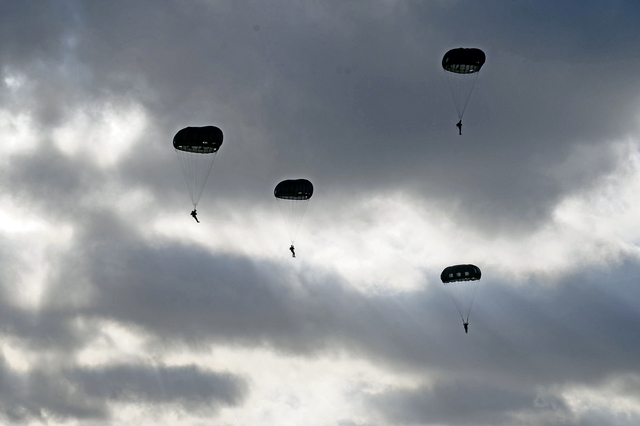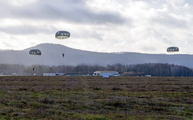 U.S. Airmen and U.S. Soldiers descend into the drop zone during Operation Santa Drop at Ramstein Air Base, Germany, Dec. 20, 2024. The operation delivered holiday cheer to the Kaiserslautern Military Community as service members landed on the installation wearing holiday sweaters. (U.S. Air Force photo by Senior Airman Kaitlyn Oiler)