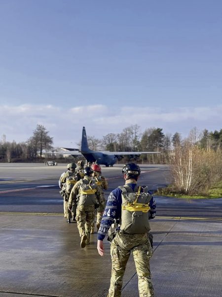 U.S. Air Force, U.S. Army and German army members walk toward a C-130J Super Hercules at Ramstein Air Base, Germany, Dec. 20, 2024. The 435th Contingency Response Group, 86th Operations Support Squadron, 5th Quartermaster Detachment, U.S. Army 16th Sustainment Brigade, the 1st Squadron, 91st Cavalry Regiment and German Parachute Regiment 26 participated in the operation. (U.S. Air Force courtesy photo)