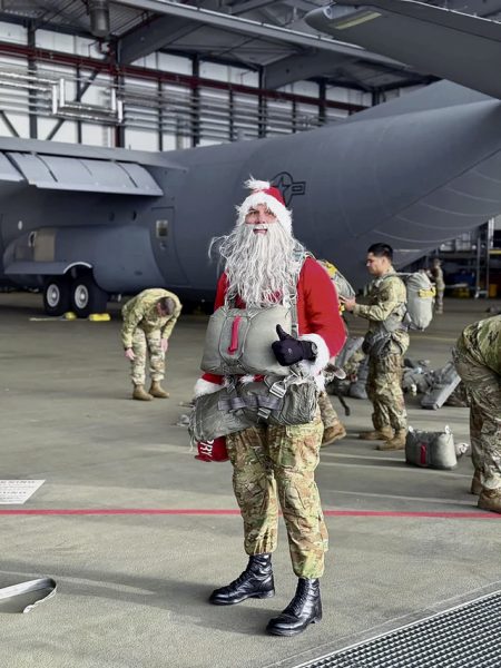 U.S. Army Chief Warrant Officer 2 Dustin Colwell, senior airdrop systems technician, dresses as Santa for the Operation Santa Drop at Ramstein Air Base, Germany, Dec. 20, 2024. U.S. Air Force, U.S. Army and German army participated in the operation to spread holiday cheer to the Kaiserslautern Military Community. (U.S. Air Force courtesy photo)