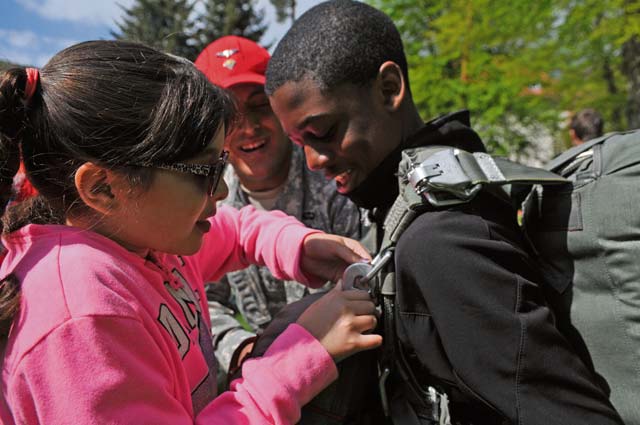 Riggers from the 5th Quartermaster Theater Aerial Delivery Company awed the students by showing them how to properly fold and pack a parachute. Afterward, several students tried on the heavy packs.