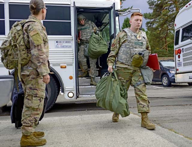 U.S. Airmen unload from a bus at Ramstein Air Base, Sept. 23. As simulated deployers for Operation Varsity 19-3, the Airmen processed the personnel deployment function line before being transported to a temporary lodging facility.