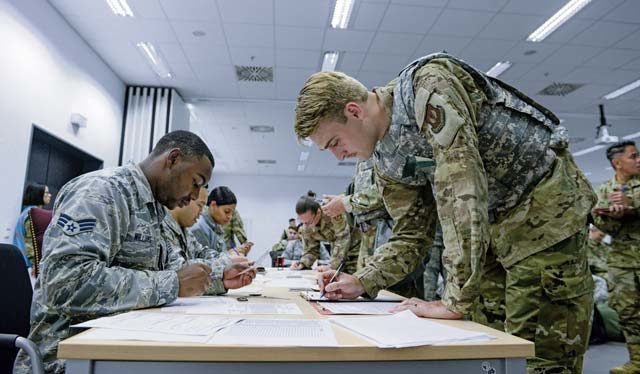 U.S. Air Force Senior Airman Johnathan Williams, 786th Force Support Squadron, processes Airmen through a personnel deployment function line during Operation Varsity 19-3 at Ramstein Air Base, Sept. 23.