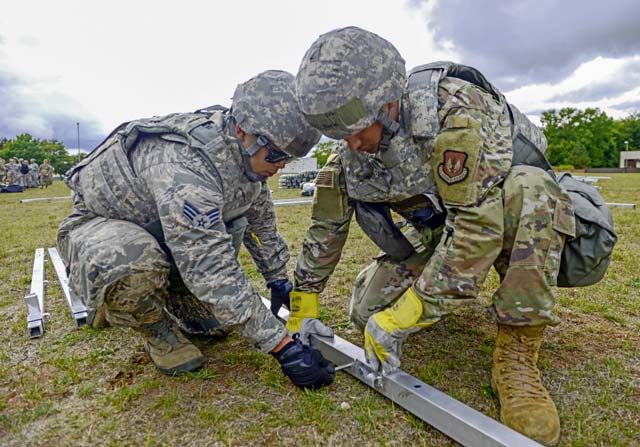 U.S. Airmen assigned to the 786th Civil Engineering Squadron build tents as part of Operation Varsity 19-3 at Ramstein Air Base, Sept. 23. The tents were used as temporary lodging for simulated deployers during Operation Varsity 19-3, a weeklong exercise designed to test the capabilities of Ramstein Airmen.