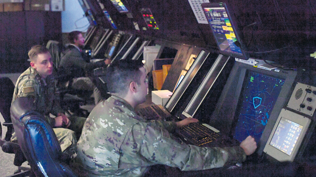 U.S. Air Force Staff Sgt. Christopher Garay, 86th Operations Support Squadron air traffic control watch supervisor, right, and Staff Sgt. Jared Martin, 86th OSS air traffic control watch supervisor, left, work at Ground Controlled Approach terminal control workstations, Ramstein Air Base, Oct. 15. GCA is the counterpart to the Tower, collectively making up ATC. By transitioning local and transient aircraft from German air traffic controllers to Ramstein Tower air traffic controllers, GCA secures safe landings.