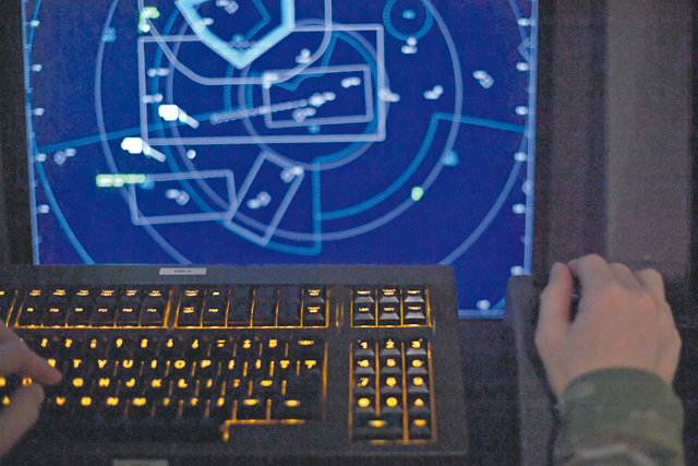 U.S. Air Force Tech. Sgt. Tanner Herring, 86th Operations Support Squadron air traffic control watch supervisor, trains on a terminal control workstation at Ground Controlled Approach, Ramstein Air Base, Oct. 15. Herring, who typically works in the ATC Tower, is cross-training to work at GCA, as well. ATC’s dual training program creates more qualified personnel, and allows for more strategic and effective operations.