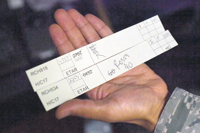 U.S. Air Force Senior Airman Torey L. Jinks, 86th Operations Support Squadron air traffic controller, holds flight progress strips at Ground Controlled Approach, Ramstein Air Base, Oct. 15. Air traffic controllers at GCA record the general information and intent of each aircraft on the strips. By monitoring this information and keeping constant communication with pilots, GCA ensures safe arrival and departure of aircraft.