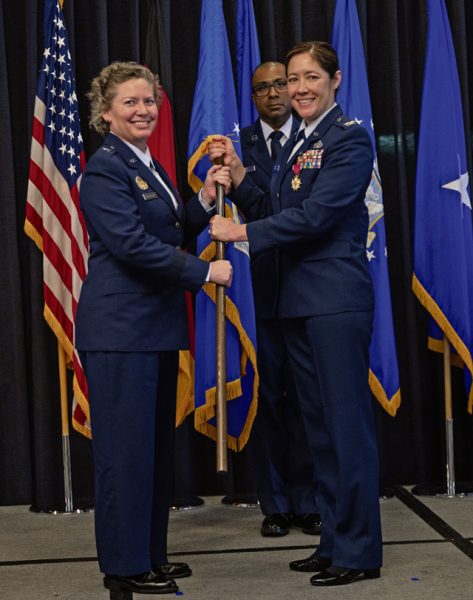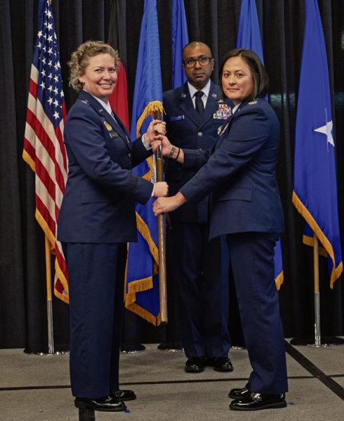 U.S. Air Force Col. Victoria J. Mayo, Air Force Office of Special Investigations 5th Field Investigations Region incoming commander, speaks to Col. Laura DeJong, 5th FIR outgoing commander, during the 5th FIR change of command ceremony at Ramstein Air Base, Germany, June 4, 2025. OSI provides U.S. Air Forces in Europe – Air Forces Africa, U.S. European Command and U.S. Africa Command, combat ready military criminal investigative organization that provides the Department of the Air Force a wartime capability with counterintelligence support to find, fix and track and neutralize enemy threats in a contested environment. (U.S. Air Force photo by Senior Airman Edgar Grimaldo)