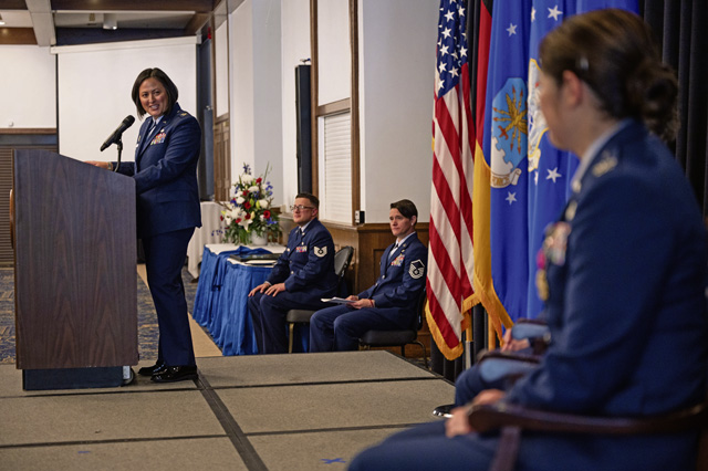 U.S. Air Force Brig. Gen. Amy S. Bumgarner, Air Force Office of Special Investigations commander, gives a speech during the AFOSI 5th Field Investigations Region change of command ceremony at Ramstein Air Base, Germany, June 4, 2025. OSI provides U.S. Air Forces in Europe – Air Forces Africa, U.S. European Command and U.S. Africa Command, combat ready military criminal investigative organization that provides the Department of the Air Force a wartime capability with counterintelligence support to find, fix and track and neutralize enemy threats in a contested environment. (U.S. Air Force photo by Senior Airman Edgar Grimaldo)