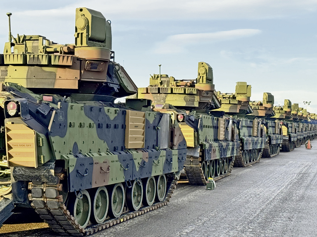 M2A3 Bradley Fighting Vehicles stand at the ready at the Coleman Army Prepositioned Stocks-2 worksite in Mannheim, Germany, Sept. 5, 2025. Army Field Support Battalion-Germany had the mission to issue nearly three dozen Bradleys at Coleman to Fort Hood, Texas, Soldiers from 2nd Battalion, 7th Cavalry Regiment, for their upcoming rotational mission to Poland.