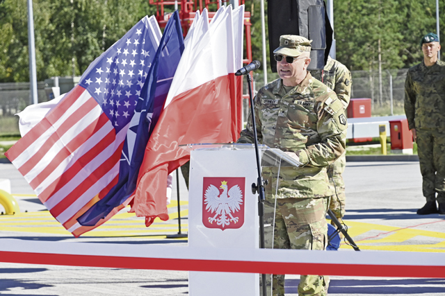 Brig Gen. John Stanley, the 21st Theater Sustainment Command deputy commanding general addresses a crowd during the Powidz Air Base Bulk Fuel Storage Facility ribbon cutting ceremony, Sept 25.