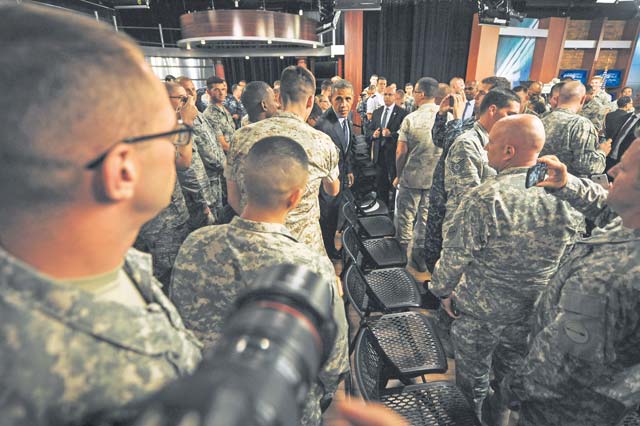 President Barack Obama greets service members before his Worldwide Troop Talk Sept. 11 from Fort Meade, Md. Obama visited the base to conduct a live, televised troop talk with service members on the 14th anniversary of 9/11 from the Defense Media Activity studios.