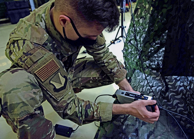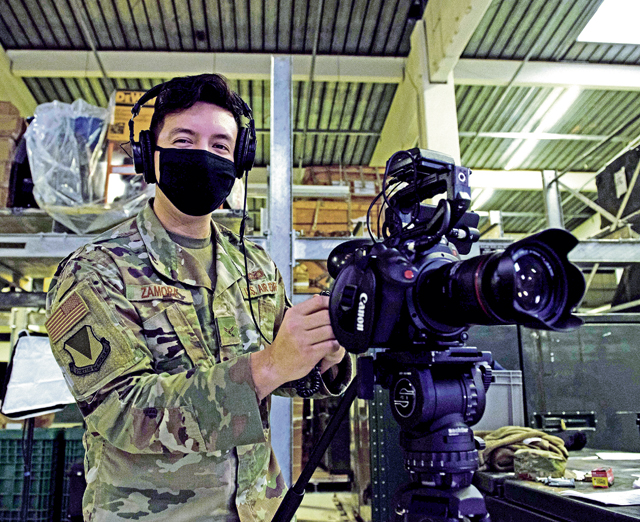 U.S. Air Force Airman 1st Class Manuel Zamora, 86th Airlift Wing Public Affairs specialist, poses for a photo in between takes on Ramstein Air Base, Dec. 21, 2020. Public Affairs specialists routinely alternate as a primary and secondary cameramen during video productions.