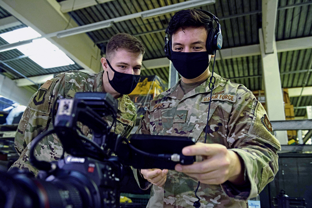 U.S. Air Force Staff Sgt. Devin Boyer and Airman 1st Class Manuel Zamora, 86th Airlift Wing Public Affairs specialists, review recorded imagery using a built-in camera monitor on Ramstein Air Base, Dec. 21, 2020. Public Affairs specialists continuously review recorded footage on video cameras to ensure imagery is in focus and audible.