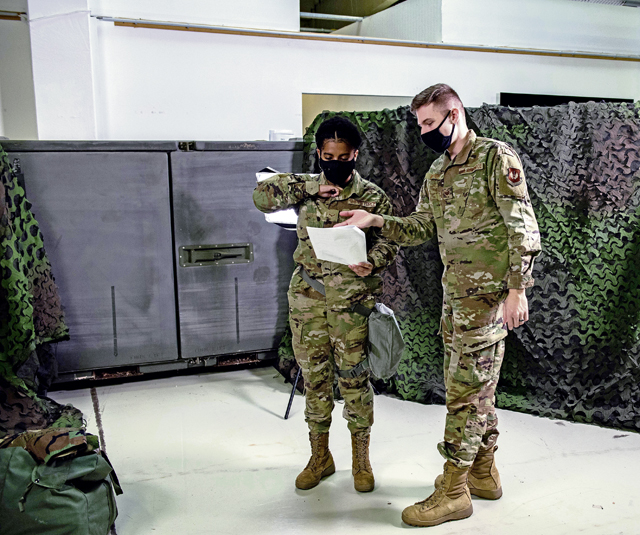U.S. Air Force Staff Sgt. Devin Boyer, 86th Airlift Wing Public Affairs specialist, provides acting advice to Airman 1st Class Shadae Bromfield, 786th Civil Engineer Squadron emergency manager, on Ramstein Air Base, Dec. 21, 2020. Public Affairs specialists routinely coordinate with actors during scripted scenes of a video production to ensure they understand their role. Airmen from various units may be given the opportunity to participate as acting talent during a video production.