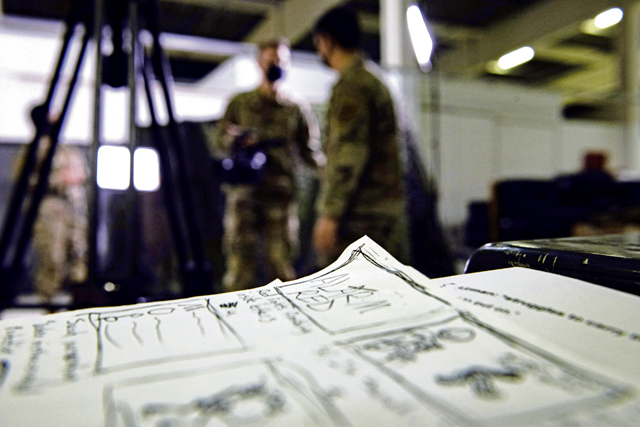 A storyboard sits in the foreground on Ramstein Air Base, Dec. 21, 2020. Storyboards are illustrated descriptions of scenes filmed as part of a video production process.