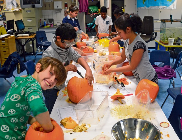 Students in Sharon Emerling’s fifth-grade class at Landstuhl Elementary School carve pumpkins. The pumpkins had already been checked for volume and weight and were deemed suitable for carving. Left photo: Fifth grader Michael Toppings looks hungry as he carves his fall pumpkin. Right photo: Jordan Ankeney and her classmates dig in to create culinary masterpieces.