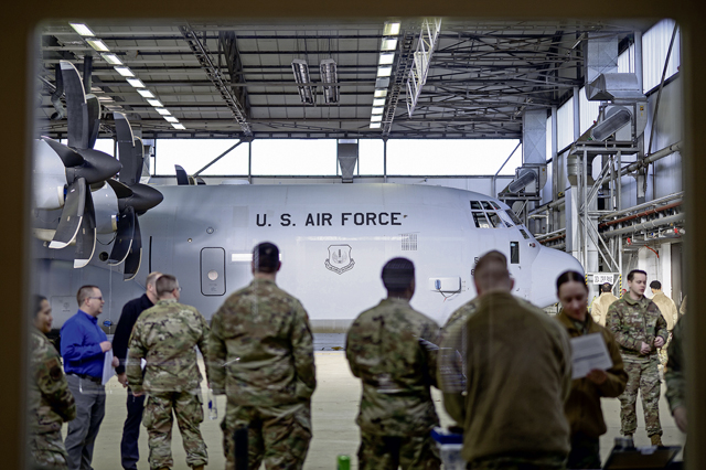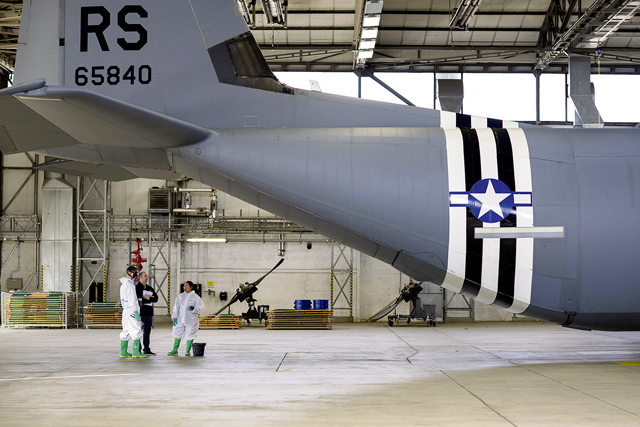 U.S. Air Force Airmen from Ramstein Air Base decontaminate a C-130J Super Hercules aircraft during exercise Radiant Falcon at RAB, Germany, March 16, 2023. The exercise consisted of leadership seminars, a practical tabletop exercise and immersive training simulations for Airmen to acquire and hone proficiency in radiological contamination detection and decontamination safety techniques. (U.S Air Force photo by Airman 1st Class Kaitlyn Oiler)