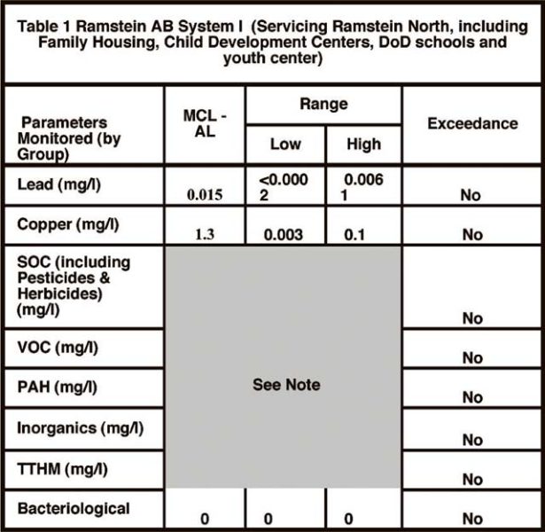 The 86 MDG Bioenvironmental Engineering Flight routinely monitors for over 60 drinking water parameters. The table shows the 1 Jan-31 Dec 2016 results for Ramstein AB System 1. Ramstein has five systems. Due to the exceptional quality of our groundwater source, treatment is for the most part, unnecessary. Chlorination is accomplished because it provides a measurable means of ensuring our water is properly disinfected. All of our water sources are chlorinated, except for Vogelweh, and some of our water sources are filtered. This is done to ensure the safest, most aesthetically pleasing product for our consumers.