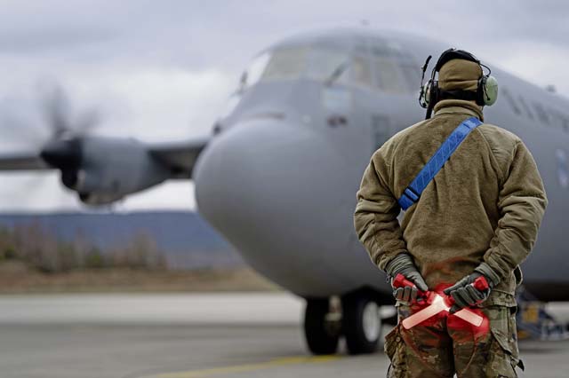 A U.S. Air Force Airman assigned to Ramstein Air Base marshals a C-130J Super Hercules aircraft prior to departure, Feb. 3. Photo by Airman 1st Class Edgar Grimaldo