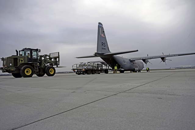 A 10K all-terrain forklift prepares to receive a luggage pallet from a C-130J Super Hercules aircraft assigned to the 37th Airlift Squadron at Rzeszów-Jasionka Airport, Poland, Feb. 4. Members of the 435th Air Ground Operations Wing arrived in Poland Feb. 3 to prepare the airport for the arrival of U.S. Army forces. Photo by Senior Airman Taylor Slater