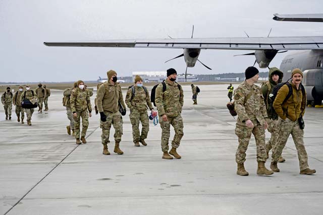 U.S. Air Force Airmen assigned to the 435th Contingency Response Group arrive at Rzeszów-Jasionka Airport, Poland, Feb. 4. Approximately 150 personnel from the 435th CRG deployed to support the operation, specializing in combat communications, air traffic control, cargo transportation and airfield management. Photo by Senior Airman Taylor Slater