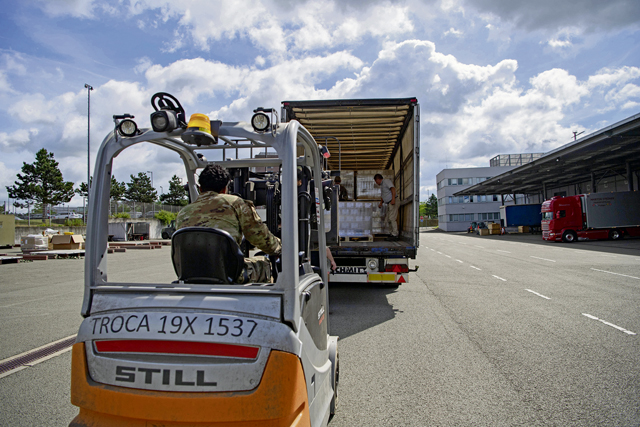 U.S. Air Force Senior Airman Arterius Cochran, 721st Aerial Port Squadron Cargo Specialist, unloads a semi-truck full of infant formula at Ramstein Air Base, Germany, May 21, 2022. Approximately 132 pallets of infant formula will be transported to the United States using U.S. Air Force C-17 Globemaster III aircraft departing from Ramstein Air Base. (U.S. Air Force photo by Airman 1st Class Alexcia Givens)