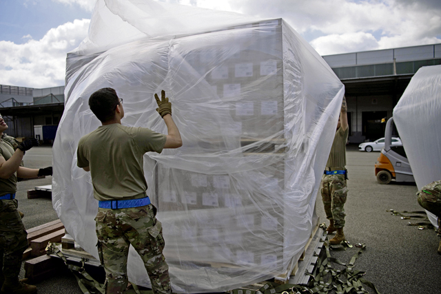 U.S. Air Force Airmen assigned to the 721st Aerial Port Squadron place plastic over a pallet of infant formula at Ramstein Air Base, Germany, May 21, 2022. During Operation Fly Formula, Airmen prepared pallets for the initial flights to the United States using U.S. Air Force C-17 Globemaster III aircraft coordinated by U.S. Transportation Command and Air Mobility Command. (U.S. Air Force photo by Airman 1st Class Alexcia Givens)