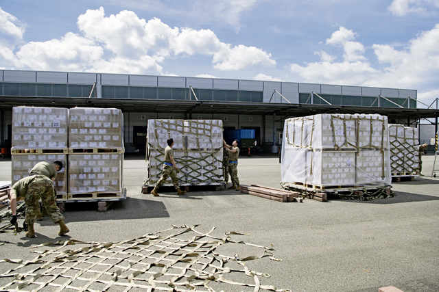 U.S. Air Force Airmen assigned to the 721st Aerial Port Squadron build pallets of infant formula during Operation Fly Formula at Ramstein Air Base, Germany, May 21, 2022. The President of the United States launched Operation Fly Formula to speed up the import of infant formula from Europe to the United States due to critical shortages there. The formula will be transported to Plainfield, Indiana via a U.S. Air Force C-17 Globemaster III coordinated by U.S. Transportation Command and Air Mobility Command. (U.S. Air Force photo by Airman 1st Class Alexcia Givens)