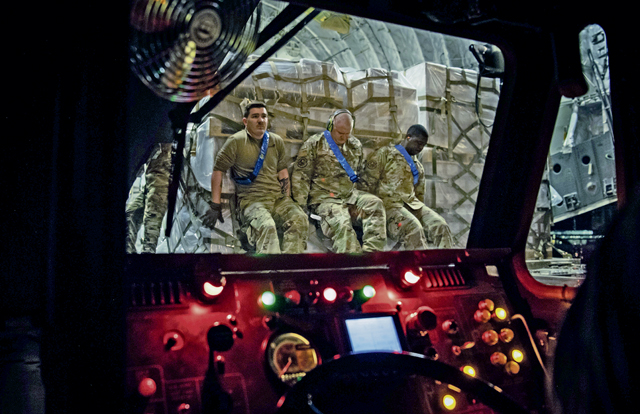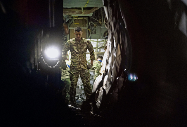 Senior Airman Jolan Besse, 721st Aerial Port Squadron loadmaster, assists Airmen as they load infant formula onto a C-17 Globemaster lll aircraft assigned to Joint Base Pearl Harbor-Hickam, Hawaii, at Ramstein Air Base, Germany, May 22, 2022. The infant formula arrived from Switzerland as part of the U.S. Government’s Operation Fly Formula to rapidly transport infant formula to the United States due to critical shortages there. Under Operation Fly Formula, the USDA and the Department of Health and Human Services are authorized to request Department of Defense support to pick up overseas infant formula that meets U.S. health and safety standards. (U.S. Air Force photo by Airman 1st Class Jared Lovett)