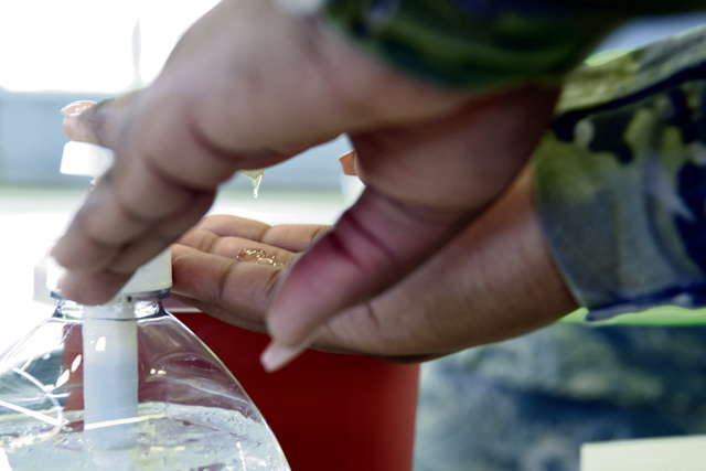 An Airman with the 86th Medical Group uses hand sanitizer prior to administering the flu vaccine to Airmen at Ramstein Air Base, Oct. 27. The 86th Medical Group set-up in a hangar to administer flu vaccine to the masses with the ability to maintain appropriate physical distancing protocols required during the COVID-19 pandemic.