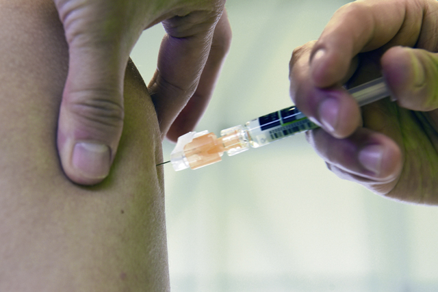 An Airman receives the flu vaccine at Ramstein Air Base, Oct. 27. The 86th Medical Group set up in a hangar to administer flu vaccine to service members to keep Ramstein Airmen deployment ready.