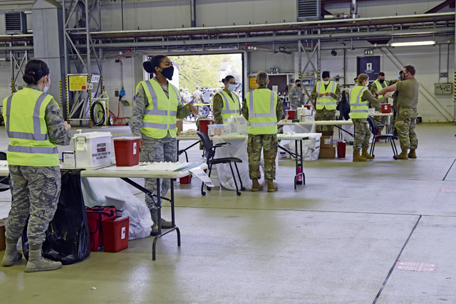 Airmen assigned to the 86th Medical Group set up in Hangar 3 to administer flu vaccine to the masses at Ramstein Air Base, Oct. 27. Use of the hangar allowed Airmen the ability to maintain appropriate physical distancing protocols required during the COVID-19 pandemic.