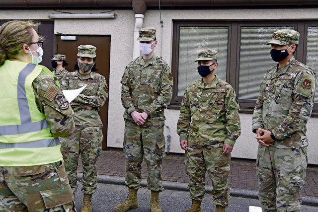 Ramstein Airmen receive a pre-screening brief prior to entering Hangar 3 for their flu vaccine at Ramstein Air Base, Oct. 27. The 86th Medical Group set up in a hangar to administer flu vaccines to the masses with the ability to maintain appropriate physical distancing protocols required during the COVID-19 pandemic.
