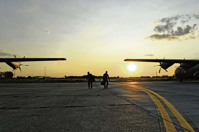 C-130J crew members with the 37th Airlift Squadron prepare to board their aircraft for a training flight Aug. 23 at Otopeni Air Base, Romania. The 37th AS conducts exercises annually throughout Europe with the aim of fostering bilateral relations and interoperability among allies.