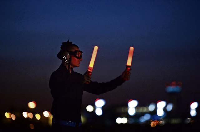 Airman 1st Class Matt Moore, 86th Aircraft Maintenance Squadron hydraulic systems journeyman, uses marshalling wands to guide an aircraft out of the ramp Aug. 23 on Otopeni Air Base, Romania. C-130Js from Ramstein arrived in Romania with more than 100 Airmen from Ramstein to conduct a bilateral exercise with Romanian forces.