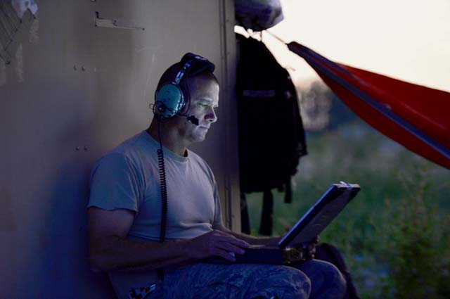 Senior Master Sgt. Gerald Bellew, 86th Aircraft Maintenance Squadron production superintendent, examines takeoff procedures during an exercise at Otopeni Air Base, Romania, Aug. 23. Aircraft maintenance Airmen are responsible for preparing aircraft and assisting pilots with takeoff.