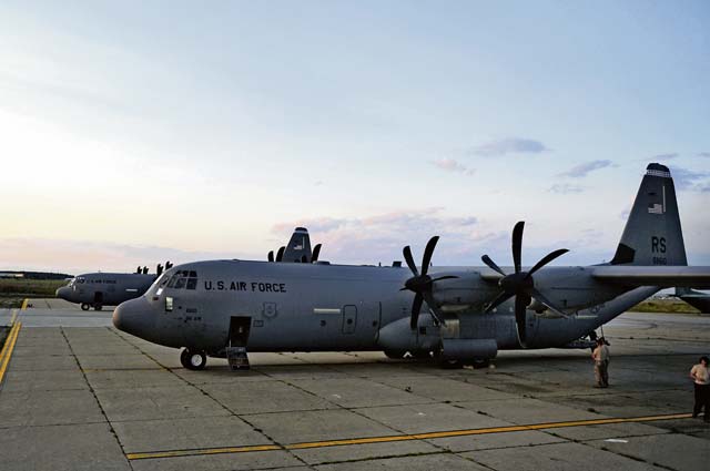 86th Aircraft Maintenance Squadron Airmen prepare a C-130J aircraft for takeoff Aug. 23 at Otopeni Air Base, Romania.
