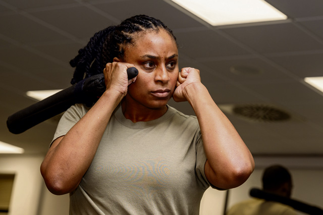 U.S. Air Force Airman 1st Class Shereika Mitchell, 86th Mission Support Group scheduling technician, stands in an offensive stance during combatives training at Ramstein Air Base, Oct. 23. Airmen from various units on Ramstein Air Base, underwent the security forces augmentee training to learn essential aspects and techniques of base defense operations in support of the 86th Airlift Wing mission in times of crisis. Photo by Senior Airman Renan Arredondo