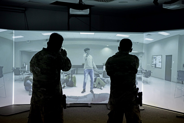 U.S. Air Force Airman 1st Class Miguel Lujan-Mojica, left, 86th Munitions Squadron conventional maintenance technician, and Airman Nathaniel Timmerman, 86th Communications Squadron Cybersecurity technician, participate in a training simulation at Ramstein Air Base, Oct. 22. The training brought together members from across the wing to serve as force multipliers in support of the security forces mission. Photo by Senior Airman Vaughn Weber