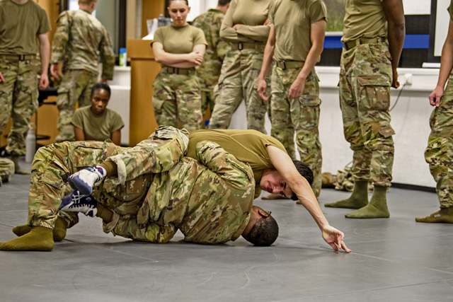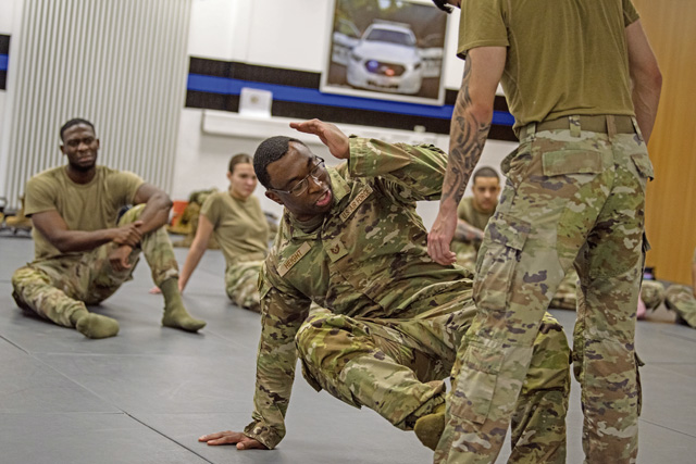 U.S. Air Force Tech. Sgt. Andrew Height, 86th Security Forces Squadron flight sergeant, demonstrates a way to create distance between the attacker in combatives training at Ramstein Air Base, Oct. 22. Photo by Senior Airman Vaughn Weber
