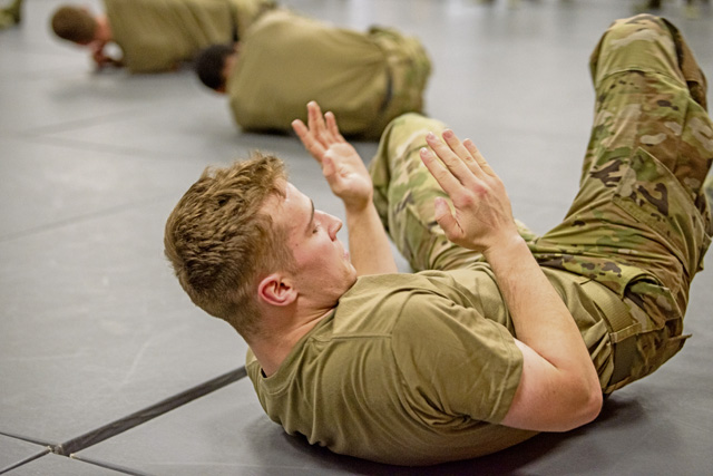 U.S. Air Force Tech. Sgt. Andrew Height, 86th Security Forces Squadron flight sergeant, bottom, demonstrates sparring with Staff Sgt. Sergio Gamez, 86th Security Forces Squadron training instructor during combatives training at Ramstein Air Base, Oct. 22. Photo by Senior Airman Vaughn Weber