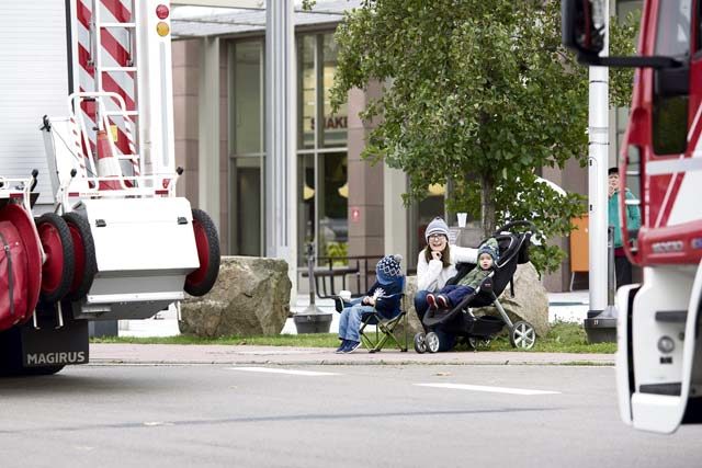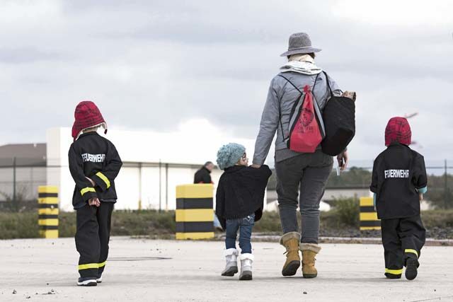 Members of the Kaiserslautern Military Community watch fire trucks pass at the Fire Prevention Week parade Oct. 7 on Ramstein Air Base.