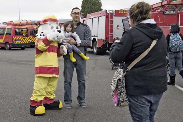 Members of the Kaiserslautern Military Community take a photo with Sparky the fire dog during the Fire Prevention Week open house Oct. 7 on Ramstein Air Base.