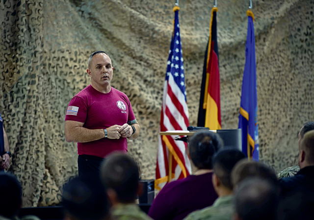 U.S. Air Force Chief Master Sgt. Chad VanCleave-Goff, 86th Security Forces Squadron senior enlisted leader, addresses participants of police week during a opening ceremony of Police Week, at Ramstein Air Base, May 15. In 1963, President John F. Kennedy signed a proclamation which designated May 15 as Peace Officers Memorial Day and the week in which that date falls as Police Week. National Police Week offers honor, remembrance, and peer support, while allowing law enforcement, survivors, and citizens to gather and pay homage to those who gave their lives in the line of duty.