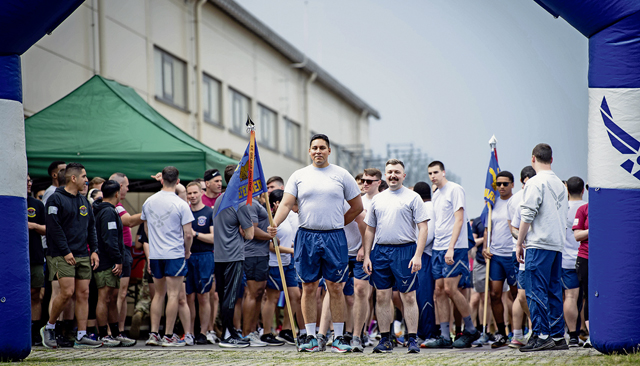 U.S. Air Force Senior Airman Roy Calatayud, center, 1st Combat Communications Squadron communications security responsible officer, and Senior Airman Charles Putnam, right of Calatayud, 721st Aircraft Maintenance Squadron avionics journeyman, stand at the starting line of a 5k during Police Week at Ramstein Air Base, May 15.