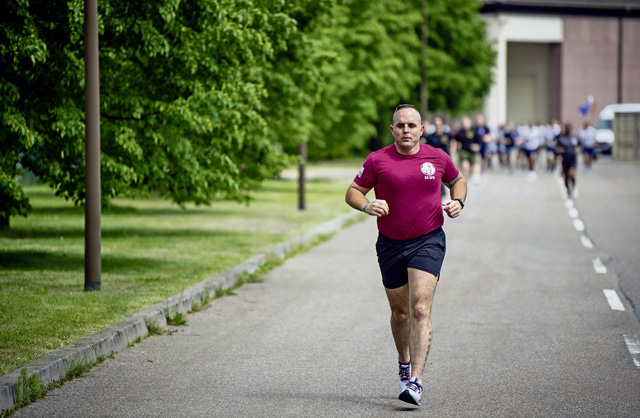 U.S. Air Force Chief Master Sgt. Chad VanCleave-Goff, 86th Security Forces Squadron senior enlisted leader, runs during a 5k memorial event during Police Week at Ramstein Air Base, May 15. During the week, the base held several events honoring Police Week including a Defender Challenge, 5K run and a final guardmount.