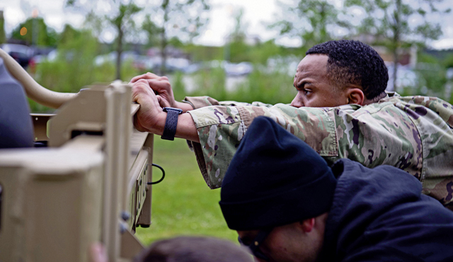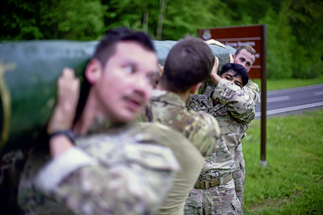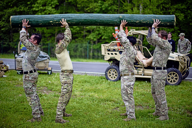 Contingency Response team members assigned to the 435th Security Forces Squadron perform log presses as part of the Defender Challenge during Police Week at Ramstein Air Base, May 16.