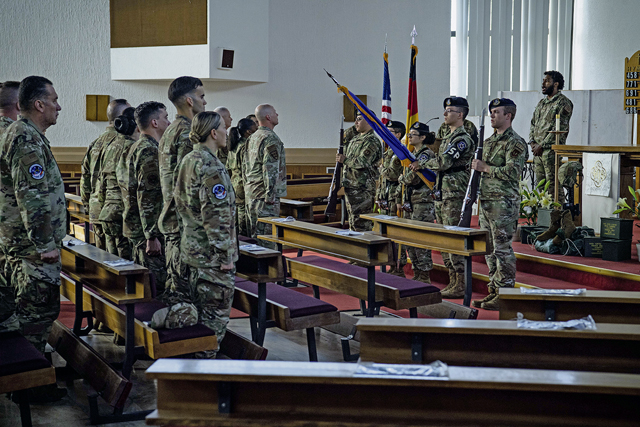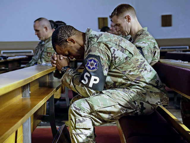 U.S. Air Force Senior Master Sgt. Skylor Hunt, 569th United States Forces Police Squadron logistics superintendent, bows his head for an invocation during Police Week’s final guardmount at Ramstein Air Base, May 19.