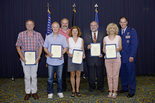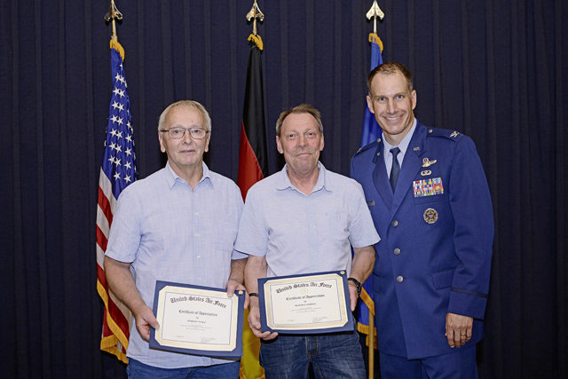 Col. Matthew S. Husemann, vice commander of the 86th Airlift Wing, greeted the guests of honor and presented them with certificates and pins. Thomas Meschkat, chairman of the works council Ramstein I, addressed the guests with a speech. Representatives of the works council Ramstein I, Ramstein II, Defense Logistics Agency and Defense Commissary Agency offices congratulated the guests of honor on their anniversaries.