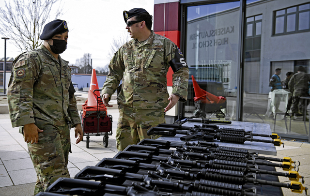 U.S. Air Force Nathan Craddock, 569th United States Forces Police Squadron standardization and evaluations, clears out the magazine well of a M4 Carbine during exercise Operation Varsity 22-1 which simulated an active shooter threat at Vogelweh Air Base, March 1. To ensure the safety of all participants in this exercise, no live-rounds were used.